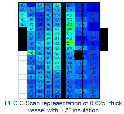 • The detection sensitivity is dependent on the footprint of the probe (liftoff/insulation thickness) and the thickness of the material (isolated pitting can be difficult to detect)